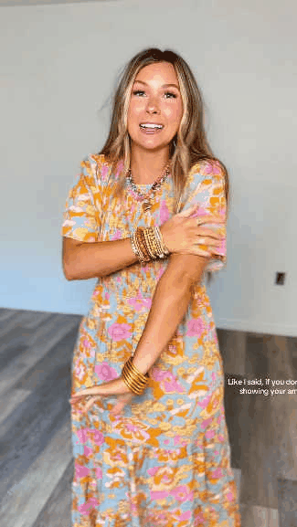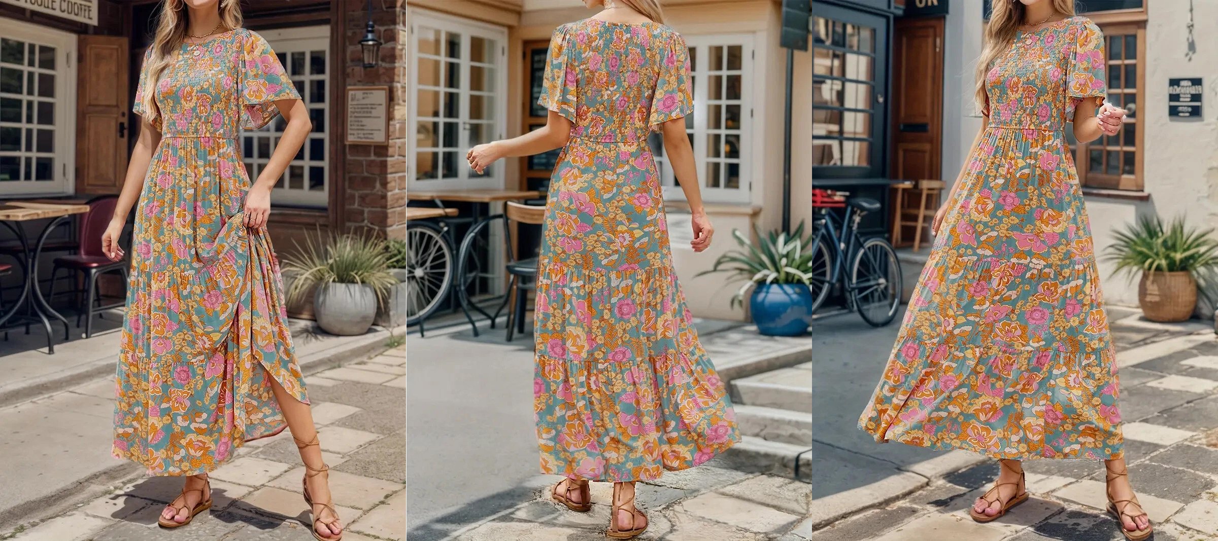 🌸 Featuring a crew neck, bold floral print, short sleeve, empire waist with tiered ruffle maxi skirt.As for the flutter sleeve can better to modify your arms, and adds more girlish and playful.